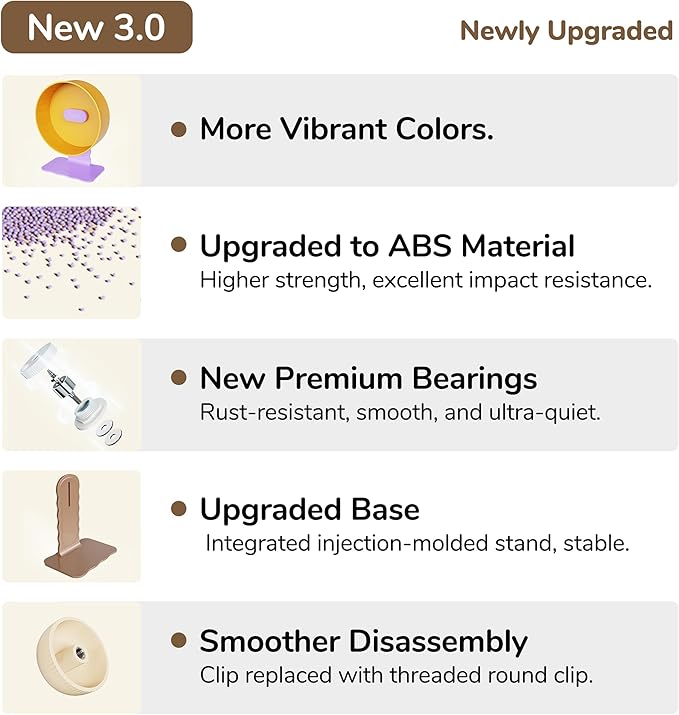 - New Premium Bearings: Our exercise wheel features high-precision bearings that ensure smooth, quiet, and durable performance. These advanced bearings help reduce noise and enhance the wheel's stability, providing a better exercise experience for your pet
