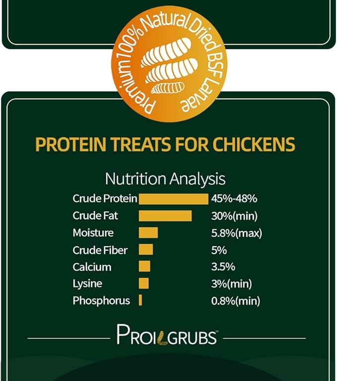 - ATTRACT TO CHICKENS: Proilgrubs BSFL have the smell and taste which are irresistible to all chickens and laying hens. The grubs' attractive appeal and delicious treat will introduce more feathered animals.