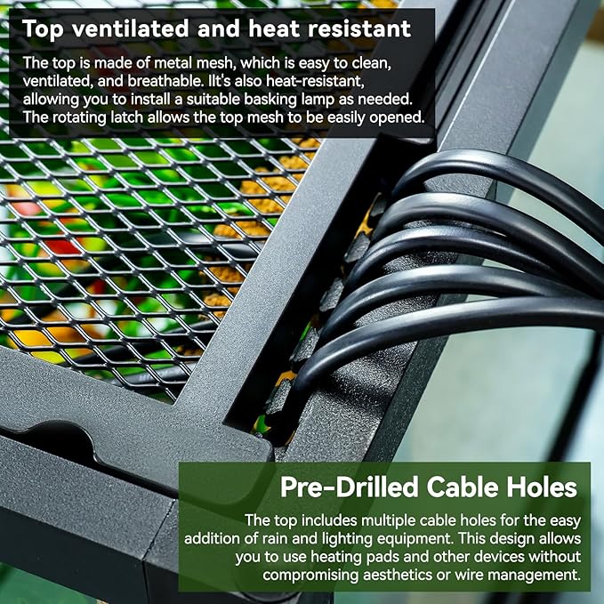 - 【Pre-Drilled Cable Holes】The top includes multiple cable holes for the easy addition of rain and lighting equipment. This design allows you to use heating pads and other devices without compromising aesthetics or wire management, making it suitable for any reptile tank, from a snake cage to a crested gecko tank.