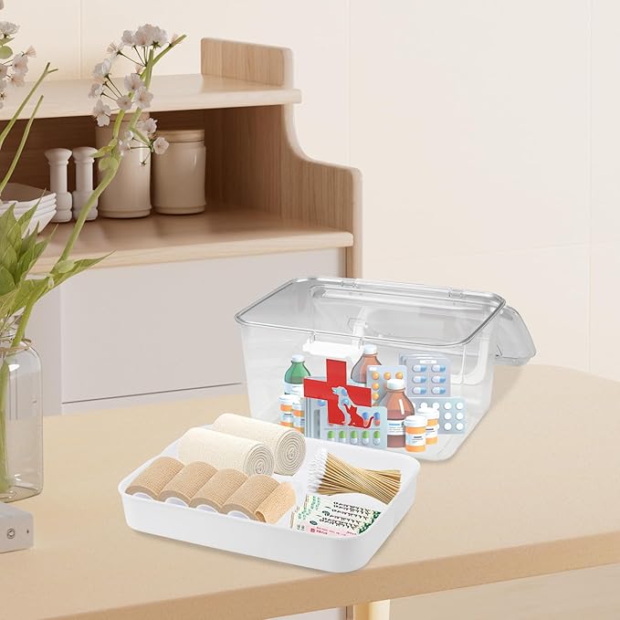 - 3.This portable medicine storage box for pet is made of high quality plastic. It holds heavy and put as much as essentials into the medicine cabinet organizer.Carrying handle on this portable first aid caddy makes it ideal for travel, camping, hiking, and packing in a rental car or work truck