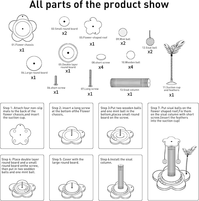 - 【Easy Installation】: Quick and easy screw assembly, comes with instructions and screws, only 4 steps to assemble the cat scratching post with 6 boards and 1 pole, no wrench needed to install with bare hands. Your furry friend will only have to wait a few minutes to enjoy this toy.