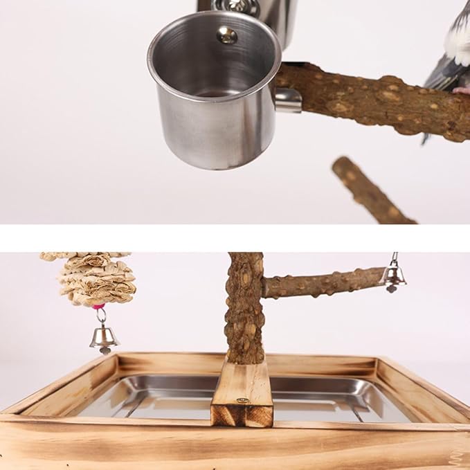 Natural Wood Parrot Stand - Ideal Toy & Accessory for Parakeets, Canaries, Cockatiels, Conure, Lovebirds - Large Bird Perch Stand with Removable Tray and Feeder Cups - Perfect Pet Birds Playstand