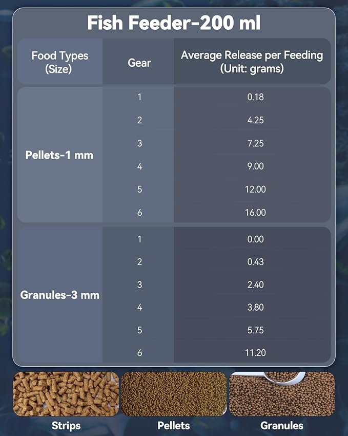 - 200 ml Capacity: Perfect auto fish food dispenser to take care of your fish during your short-term absence for working overtime, vacations, business trips, etc. No more starving fish. (NOTE: Only for holding dry fish food like Pellets, Granules and Strips!)