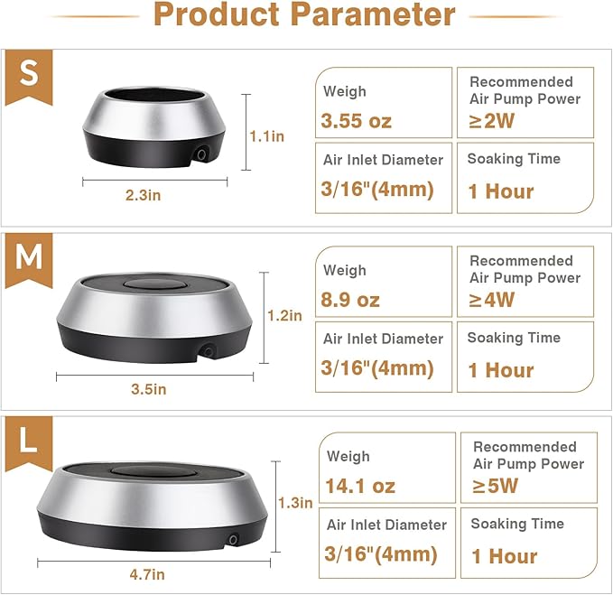- Size: 4.7" D x 1.3" H, weighs 0.88 pounds, which can be easily sink to the bottom of the fish tank and heavy enough without floating away. Recommended powered by 5 watts or stronger air pump