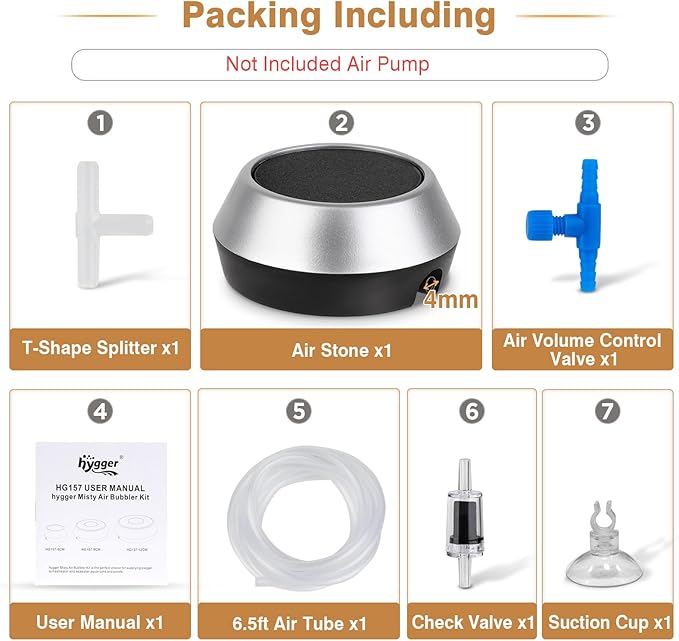 - Accessory Kit, But Not Include Air Pump: The set includes a 3.5-inch aerator stone, a 6.5ft air tube (4mm diameter), a T splitter, a check valve, a suction cup to secure the tubing and a control valve to adjust the size of the bubbles