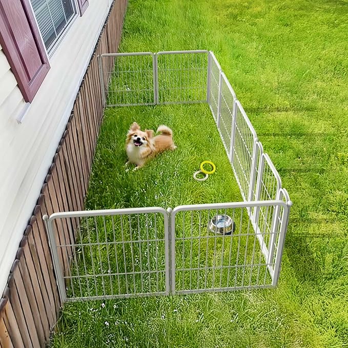 - Super easy to assemble: It won’t take you more than 5 minutes to assemble these portable dog fences as well as pack them away due to the rod-connected design. Meanwhile, panels can be added or removed freely to give you a fully flexible area and arrange the dog pen in any shape you need.