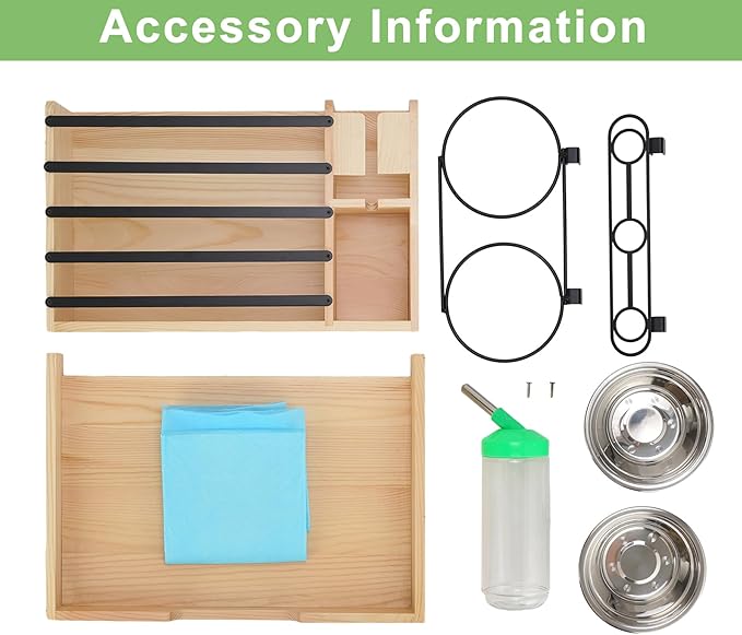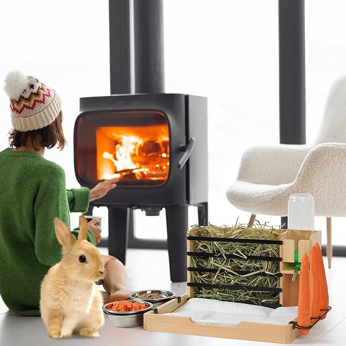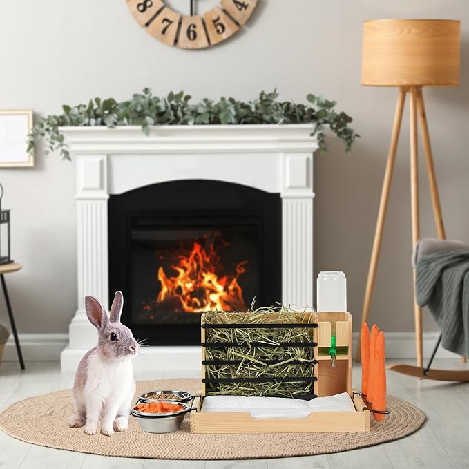 - 4-IN-1 Rabbit Hay Feeder: :This wooden small animal hay feeder features a 500ml water bottle, two iron bowls, a carrot rack, and also comes with two disposable pee pad. (Note: If you need more pee pads after using them up, please purchase them on your own.) It conveniently provides everything your small animals need. It is suitable for rabbits, guinea pigs, chinchillas, hamsters, dwarf rabbits, bunnies, and ferrets.