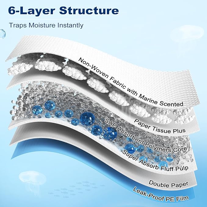 - Innovative 6-Layer Design: The paper part of this product comes from FSC-certified paper; Top non-woven fabric layer for quick absorption and fast drying; second paper tissue layer to absorb liquid; third layer of super absorbent polymer to turn liquid into gel; fourth layer of fluff pulp for extra moisture control; fifth layer of paper tissue for added protection; sixth layer of PE film to prevent leaks and protect floors
