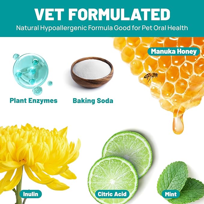 - Vet-Approved Formula: Our pet dental wipes combine natural ingredients to actively support your pet's oral health. Plant Enzymes target and break down plaque biofilm at the source, preventing tartar buildup. Baking Soda neutralizes acids for fresher breath. Manuka Honey calm sensitive gums. Tea Polyphenols inhibit harmful oral substances. It's safe if licked or ingested. Perfect for pets with sensitive gums, weak enamel, or those who resist conventional dental care.