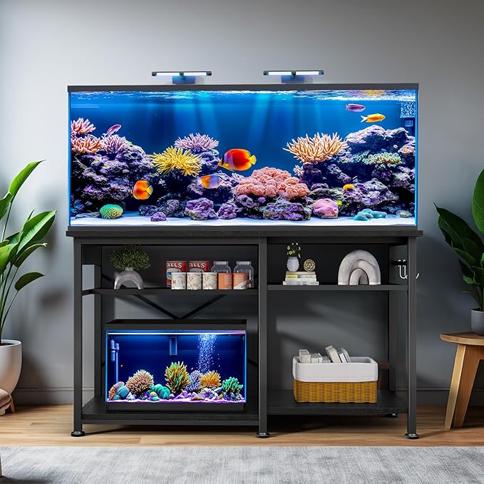 - Spacious and Versatile Design: Our aquarium stand is expertly crafted to support 55-75 gallon fish tanks, offering a generous top surface area (49.21" x 18.9") that ensures a stable and secure foundation for your aquarium setup. The bottom shelf is large enough to accommodate a 20-gallon tank, making it perfect for smaller aquariums, as well as mini reptile or amphibian enclosures. This thoughtfully designed stand maximizes your space, helping you organize your aquatic or terrarium setups with ease and efficiency.