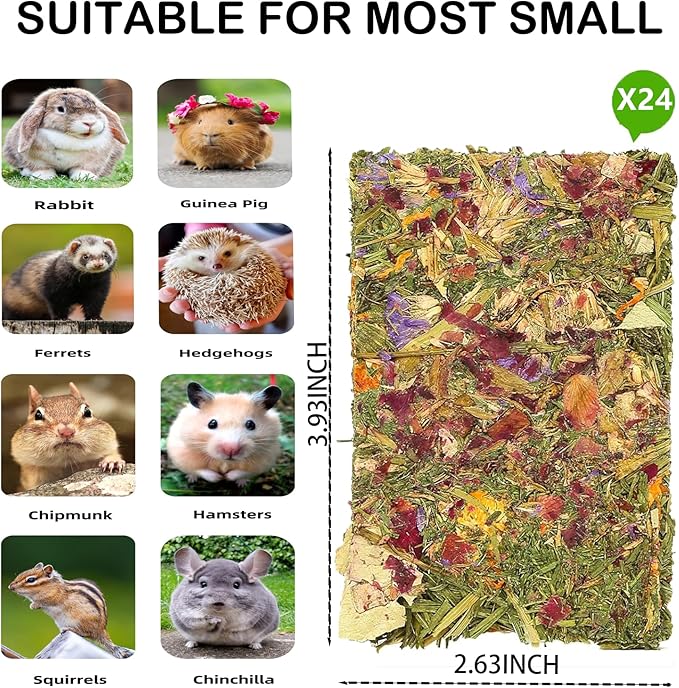 - 4.[24 Packs Individually Vacuum-Packed] 24 packets of chips, 4inch (L) 2.6inch (W) 0.2inch(H) Each piece of our product is vacuum compressed and packed for easy storage, clean and hygienic, no mould and easy feeding. You can take this and interact with your pet in a friendly way.Organic chew toys made from natural timothy hay, baked, shaped and sterilized by high temperature.