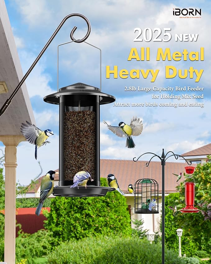 - 【Design For Outdoors Durable Use】iBorn Brings new Whole Metal Bird Feeders For Outdoors in 2025, aim to provide bird lovers with high-quality and durable using experience. Whole metal construction will make it stronger and heavy duty, not easy to get damage by weather or animals. No worry about being breaking or aging and becoming fragile easily, keep it for a longer time.