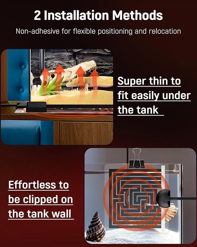 - Easy to Install: Super thin to fit easily under a reptile tank or against its wall. The non-adhesive design allows for flexible positioning and relocation. With a 4.9-foot-long power cord, the DC-powered heat mat can connect to a power source more handily