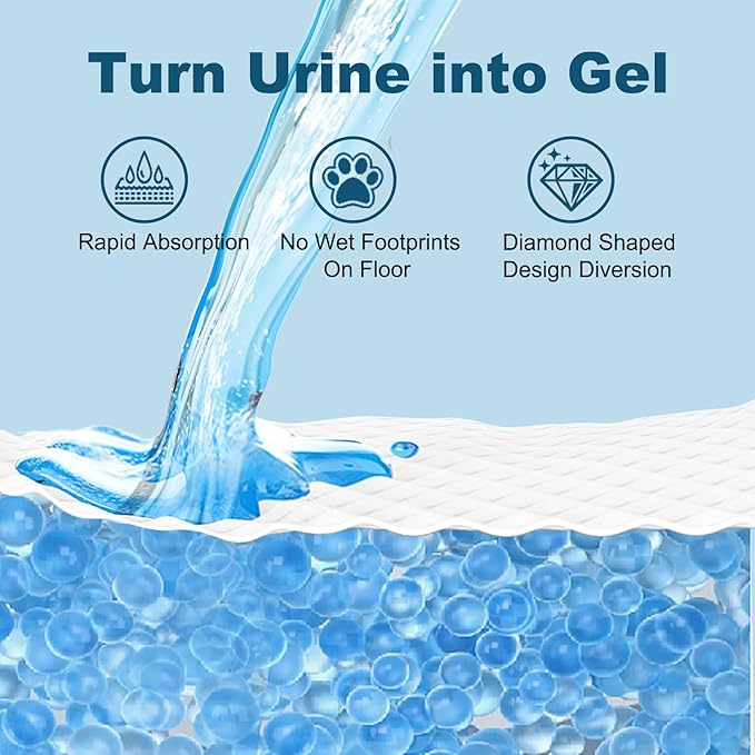 - 【Faster Absorption with Diamond Quilting Surface】Our doggy pads are made of 6 strong layers material to prevent tearing, the diamond quilted design with super water locking fast diversion, faster infusion and absorption of liquid, make dog training pads are easy to pick up without leakage or overflow.