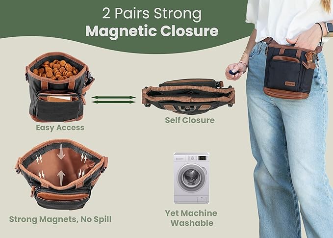 - DURABLE & STYLISH DESIGN: This dog treat pouch features double stitching and a metal buckle for enhanced durability. Its sleek, elegant look & premium material ensure long-lasting use, making it the ideal accessory for dog training or daily outings.