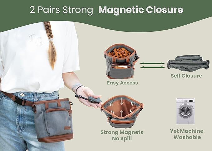 - DURABLE & STYLISH DESIGN: This dog treat pouch features double stitching and a metal buckle for enhanced durability. Its sleek, elegant look & premium material ensure long-lasting use, making it the ideal accessory for dog training or daily outings.