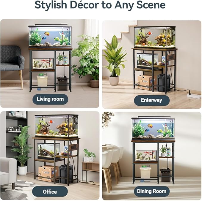 - 4-in-1 Power Outlet:Ditch the tangled cords! This stand features a convenient 4-in-1 power center with 2 AC and 2 USB outlets. You can choose to install it on the left or the right side of the stand! Power filters, heaters, lights, and charge devices effortlessly. Keep your aquarium area tidy and organized with this practical solution.