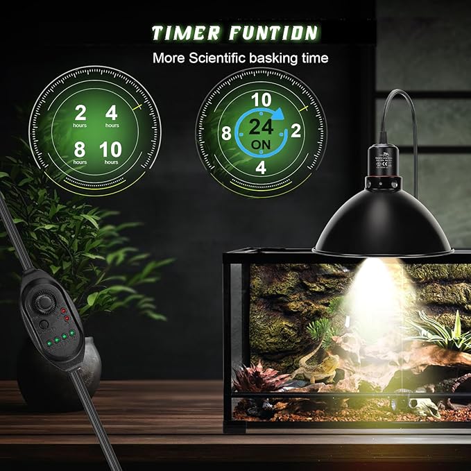 - Precision Dimming & Timer Control – Adjustable dimmer switch allows customized heat/light intensity; built-in timer (up to 12hrs) automates day/night cycles, reducing energy costs and mimicking natural habitats.