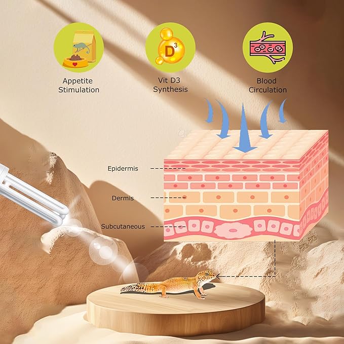 - Powerful Desert UVB Light - The 13W UVB bulb is specially designed for desert-dwelling reptiles, such as bearded dragons and leopard geckos. It mimics the intense sunlight of desert environments, supporting the reptiles' natural basking behavior while providing the UVB rays necessary for calcium absorption and bone health.