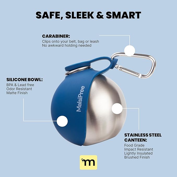 Malsipree 2-in-1 Portable Dog Water Bottle & Bowl for Small Dogs - Leak Proof & Insulating - Travel Water Dispenser - Stainless Steel Bottle & Silicone Bowl - Walking & Hiking (10 fl oz, Navy)