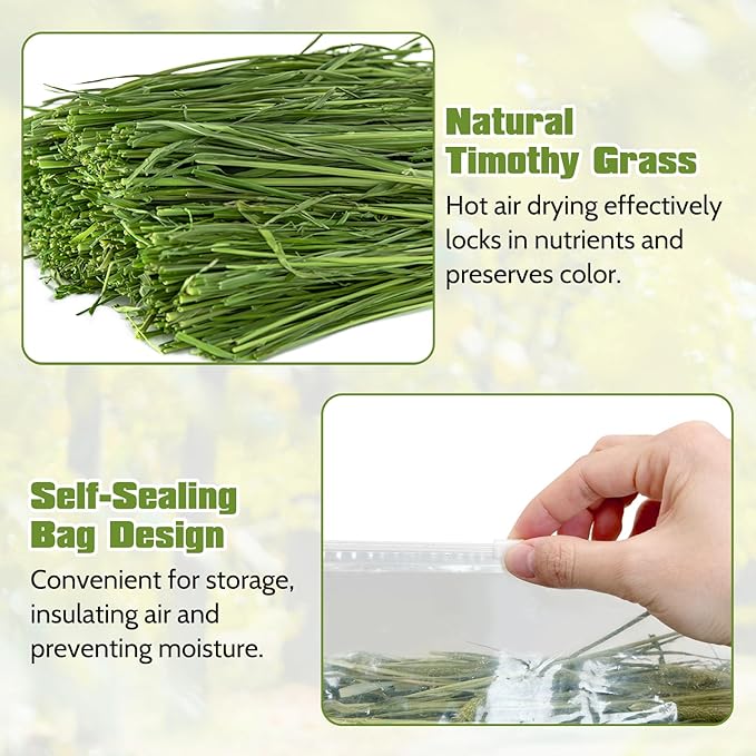 - [Hot Air Drying]: Timothy hay for rabbit is dried in hot air for 10 hours, effectively retaining the fresh green color and nutrients of timothy hay, with soft leaves and long, crisp stems, making it very friendly to small pets