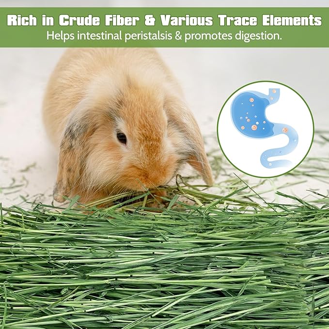 - [Nutritionally Balanced]: Rabbit hay is rich in protein, crude fiber and vitamins, making it the ideal hay for rabbits, guinea pigs, chinchillas and hamsters. The natural fresh aroma of the hay attracts small animals to chew it