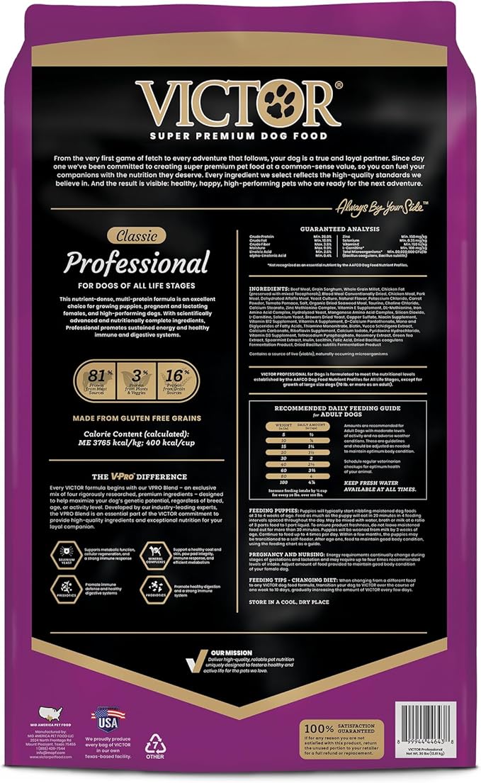 - PROFESSIONAL DOG FOOD: VICTOR Professional dog food is a gluten free, 26% protein kibble that has been popular with active and sporting dogs for years. This dog food keeps your pet active and vibrant, promoting their endurance and performance during all life stages.