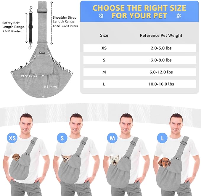 Lukovee Pet Sling, Hand Free Dog Sling Carrier Adjustable Padded Strap Tote Bag, Shoulder Bag with Safety Belt & Front Pocket for Small Dog Cat Puppy (Grey-WY,M)