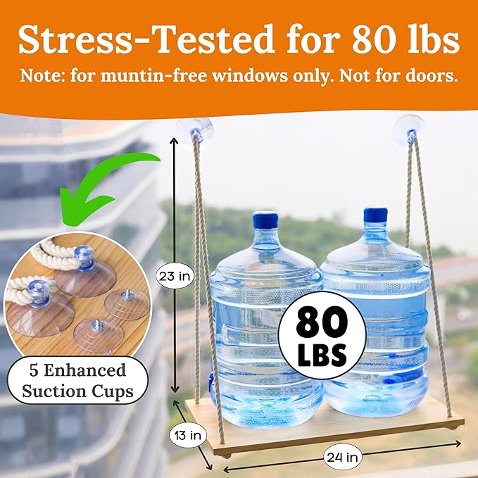 - Strong & Sturdy Frame: Built with a solid pine wood board and thick cotton ropes, and enhanced with 5 strong suction cups capable of supporting up to 80 lbs, our cat window seat guarantees durability and a security while your feline friend enjoys the view.