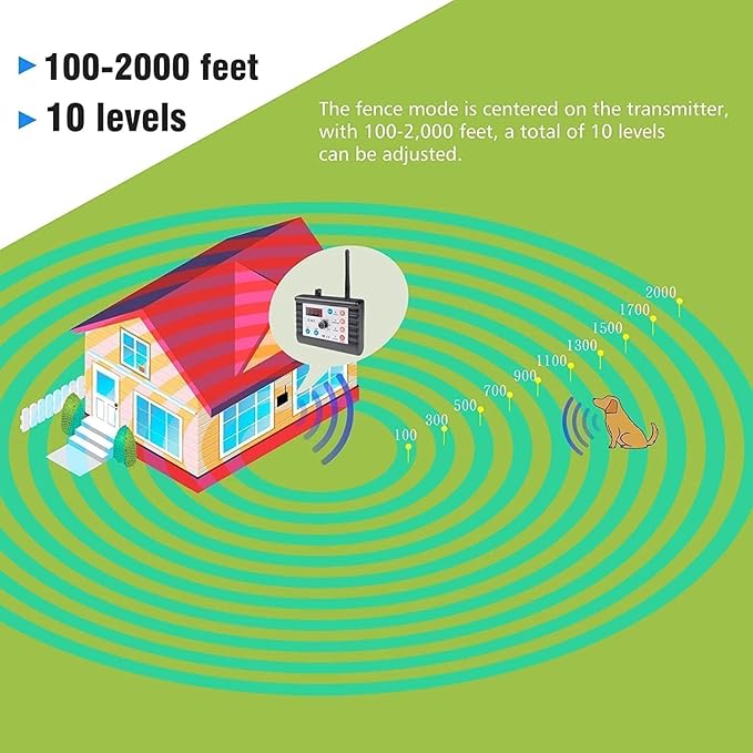 - When the dog goes out of the signal range of the transmitter, the receiver will issue a warning. Warning method: first, vibrate for 3-5 seconds, then static electric shock for 3-5 seconds. If the dog does not return to the safe area after working in a cycle twice, the receiver will keep sounding a warning tone until the dog returns to the safe area.