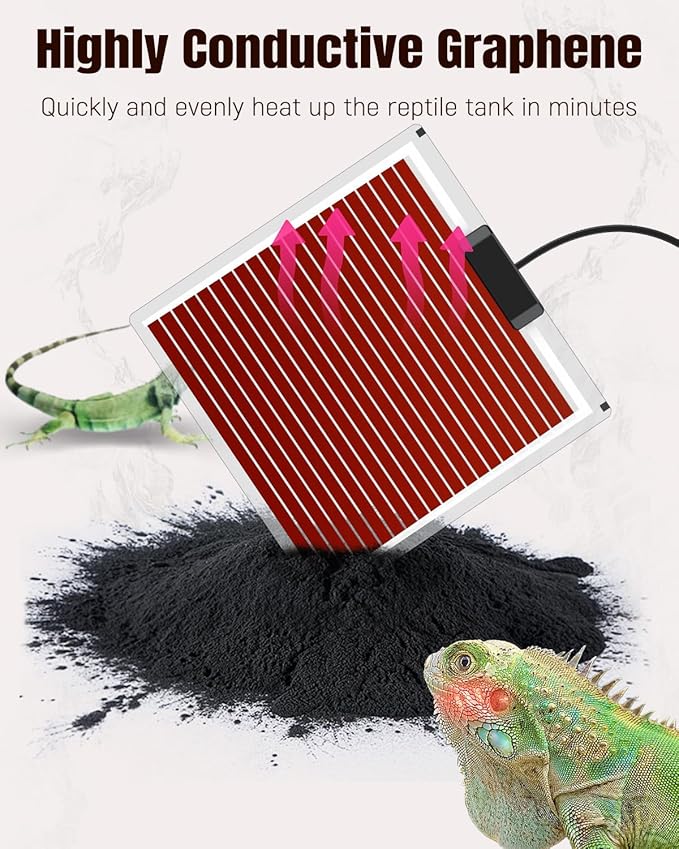 - Fast & Even Heating: Power: 28 W. Adopting graphene as its heating material, the reptile heat pad features higher thermal conductivity and longer longevity. Quickly and evenly heat up the terrarium in minutes. Always keep reptile pets cozy and vigorous