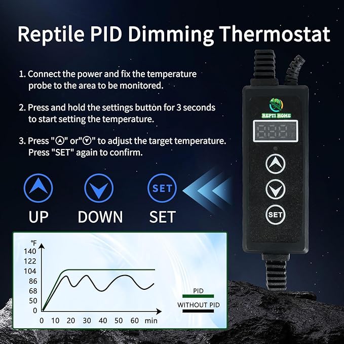 - Temperature Control & Timer: Our reptile lamps are equipped with thermostats and built-in high-precision sensors that monitor and regulate temperature in real time. They also feature a daily cycle function that automatically repeats itself.