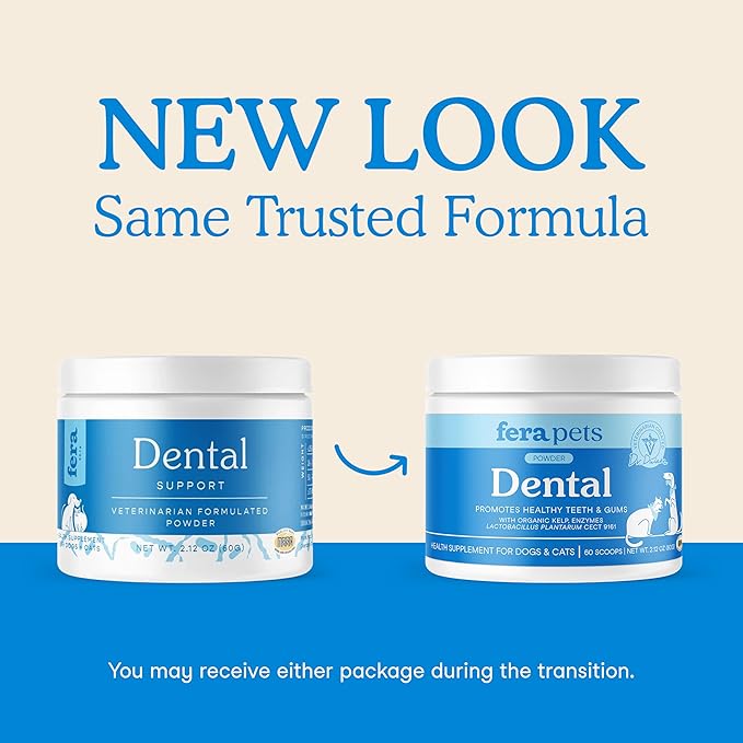 Fera Pets Cat & Dog Dental Support Powder - Supports Fresh Breath - Promotes Healthy Teeth and Gums - Targets Tartar Build-Up - Includes Kelp, Enzymes & Postbiotics - 60 Scoops