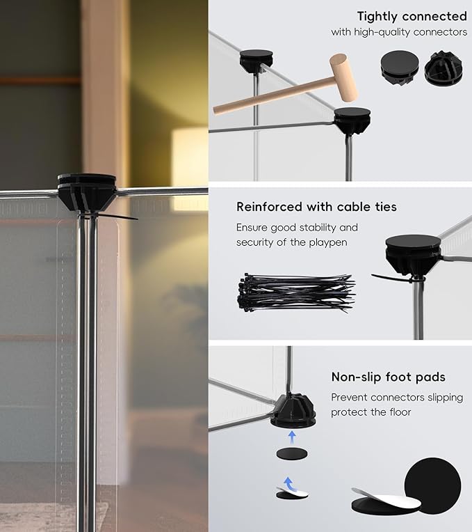 - Stability and Protection: Equipped with 42 nylon straps to securely fasten the small pet fence, and 14 anti-slip mats to prevent the fence from sliding on the floor, providing a stable play area for your pets.