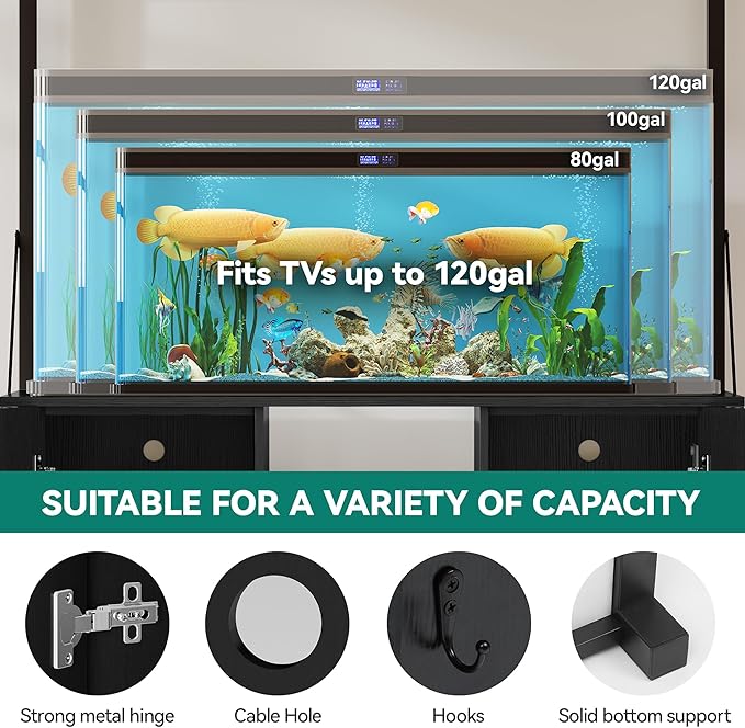 - ORDERLY STORAGE: YITAHOME fish tank stand has an extra shelf on the top to place plants, photo frames and other decorations, designed with 6 compartments for storage, featuring 2 open storage spaces and 4 hidden storage spaces with adjustable or removable dividers on the left and right sides.The aquarium with stand easily keeps everything organized, equipped with 2 hooks on the side for easy storage. The built-in cabinet stores fish food, cleaning tools, and other accessories