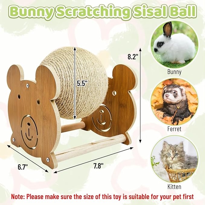 - Orb Scratcher Size: The size of frame part is 6.7"×7.8"×8.2". The sisal ball is 5.5" Dia; suitable for small animals, such as rabbits, chinchillas, ferrets, kittens; please confirm that our rabbit scratching pad is suitable for your pet before purchase