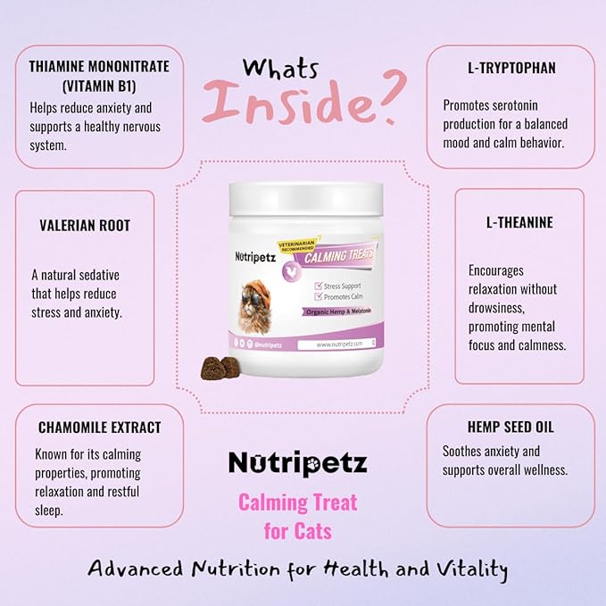 - Effective Cat Anxiety Relief – These cat calming treats are formulated with Thiamine Mononitrate, L-Tryptophan, and Valerian Root to naturally reduce stress, providing cat stress and anxiety relief in any situation.