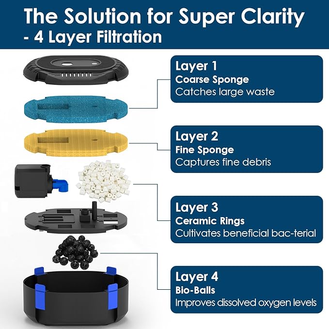 - 4-LAYER ULTIMATE FILTRATION - This complete pond filtration system combines 4-layer filtration stages: 1 - COARSE SPONGE traps leaves and large debris; 2 - FINE SPONGE captures smaller particles; 3 - CERAMIC RINGS provide ample surface area for bene-ficial bac-te-ria growth to break down wastes; 4 - Bio-ball Improves dissolved oxygen levels. Working together, these filtration components help maintain a crystal-clear pond.