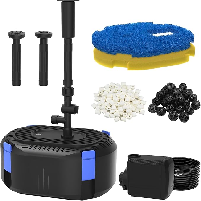 - COMPLETE FOUNTAIN KIT - Including fountain pump, 3 spray nozzles, filter media, and all hardware. Simply place the unit in your pond, connect the components, and enjoy cleaner water and beautiful fountain displays with minimal setup required. The perfect low-maintenance solution for year-round pond enjoyment!