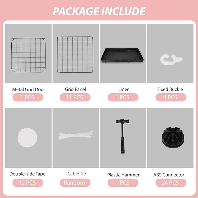 - Easy to Assemble:Set up your guinea pig cage in 15 minutes! The ABS connectors make it simple to snap the 11.8" × 11.8" panels together,no tools required. Designed for small animals, this enclosure provides a secure and fun play area. The open-grid design allows you to watch your pets from any angle and enjoy their adorable moments.