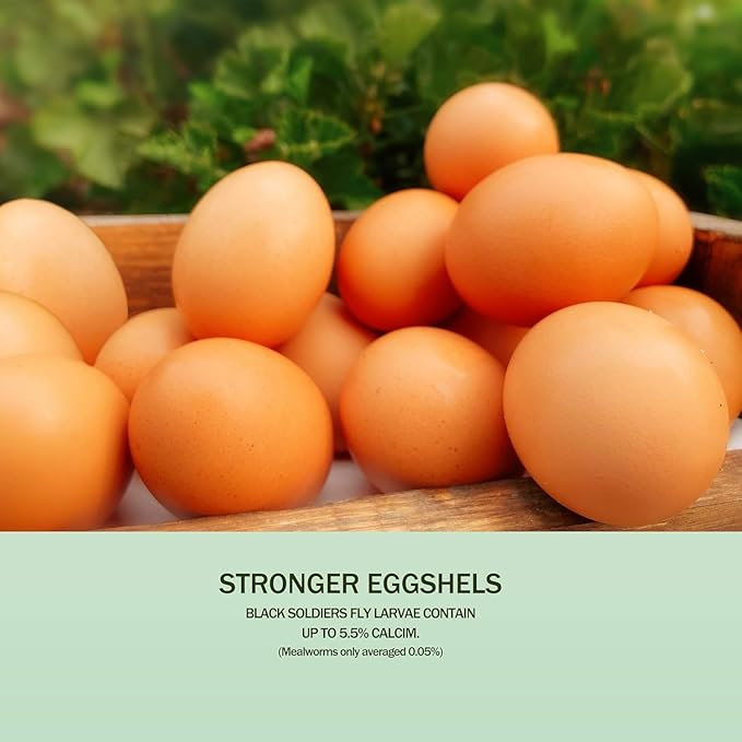 - HEALTHY & NUTRITIOUS - 11 LB Black soldier fly larvae dried. Much more nutrients than mealworms, 85 times more calcium. Superior quality compare to mealworms, black soldier fly larvae provide essential nutrients that helps Chicken, Hen, Bird, Reptile enhance egg production and promote stronger eggshells. After 1 month consumption of BSFL, most times you can see a clear difference on stronger eggshell of your hens