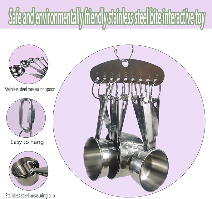 - Stainless steel spoon measuring cup pendant makes Kewmont bird toy, providing a safe and environmentally friendly chewing experience for your parrot friends