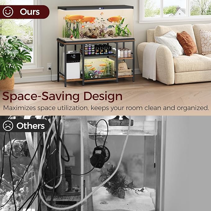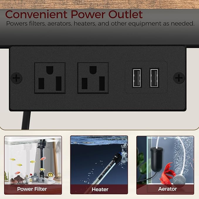 - Fish Tank Stand with Power Hub: The power outlet with 2 AC and 2 USB ports meets the power needs of aquarium equipment like filters and air pumps. This 55 gallon fish tank stand eliminates extra wiring, keeping the surroundings clean for device management
