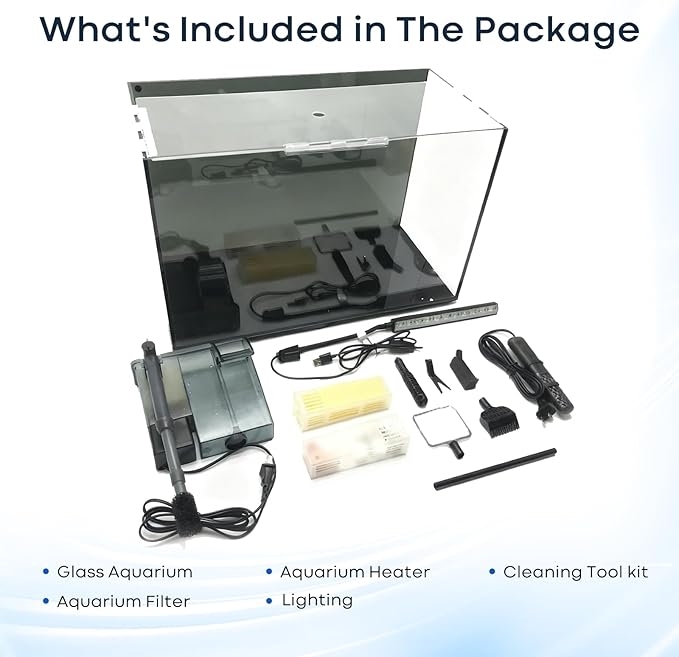 - 🐠 ALL-IN-ONE AQUARIUM KIT, PACKED WITH VALUE - Comes complete with HD float 10 gallon glass tank, heater, Hang on Back filter, LED light, 5-in-1 cleaning tool set—no extra purchase needed.