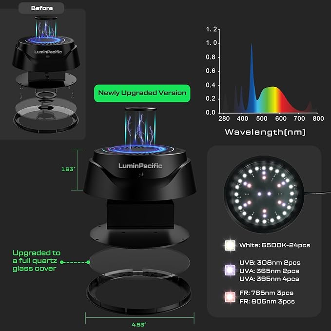 - Energy-Efficient and Long-lasting LED Technology: Our high-quality UVB LEDs have a lifespan of up to 12,000 hours, so replacement is rarely necessary. Our advanced LED technology offers a high light output while consuming very little power, helping you to save money while protecting the environment. We also provide warranty, returns and exchanges service for every LuminPacific consumer.
