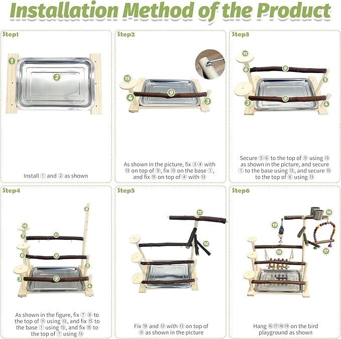 - EASY TO INSTALL: The bird playground is easy to assemble, you can follow the steps on the product picture, if you are traveling, you can disassemble it after assembling, easy to carry