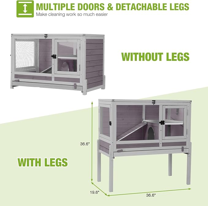- Elevated and Removable Legs: The rabbit hutch features tall, sturdy legs that elevate it off the ground, making cleaning easier. These legs can also be removed to adapt to various environments