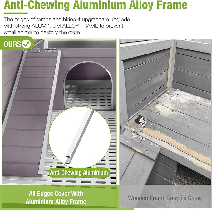 - Durable and Chew-Proof: The only cage designed with sturdy plastic floor instead of traditional wooden base that won’t absorb urine or get damaged by chewing. The metal edged ramp enhance durability and pet safety