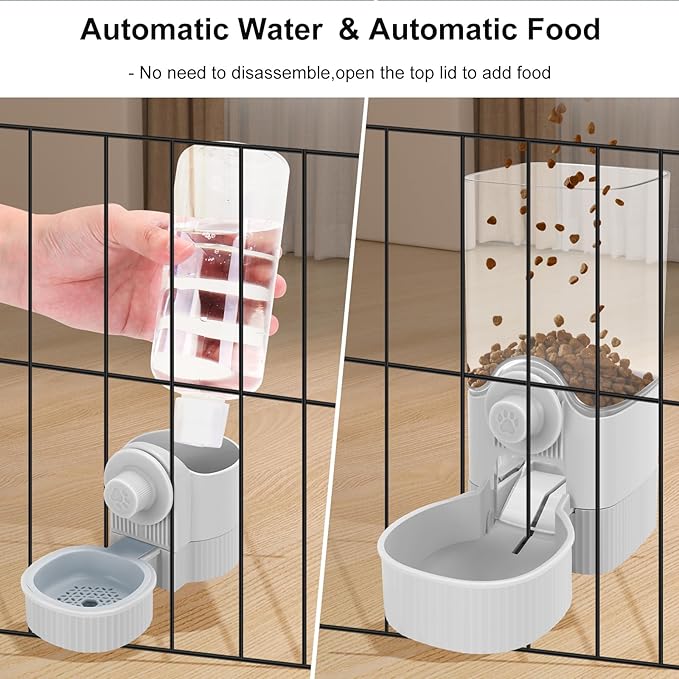 Hanging Cage Automatic Food Water Dispenser, Auto Gravity 1.2L Self-Feeding Feeder and 0.52L Waterer Set, Crate Auto Feeder Dish for Puppy Cats Ferret Bunny Guinea Pig Small Pets (Grey)