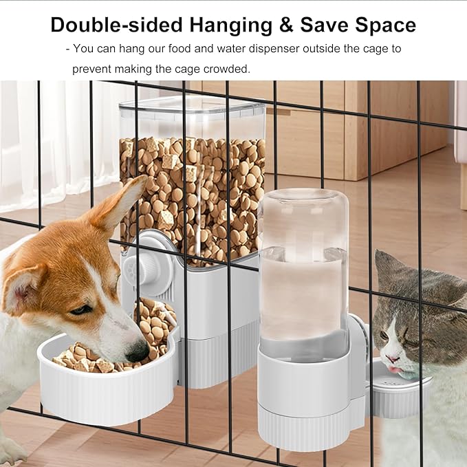 - 【Automatic Food Water Dispenser 】: Our food water dispenser set will save time instead of having to put food in non-stop, they are very convenient that you don’t have to refill the cat food and water daily. They use the gravity system like the top loading water dispenser consistently providing fresh water and food, helping keep the water somewhat cleaner. The feeder has a large food outlet and 75° ramp, so food can be smoothly filled. No electricity is needed.